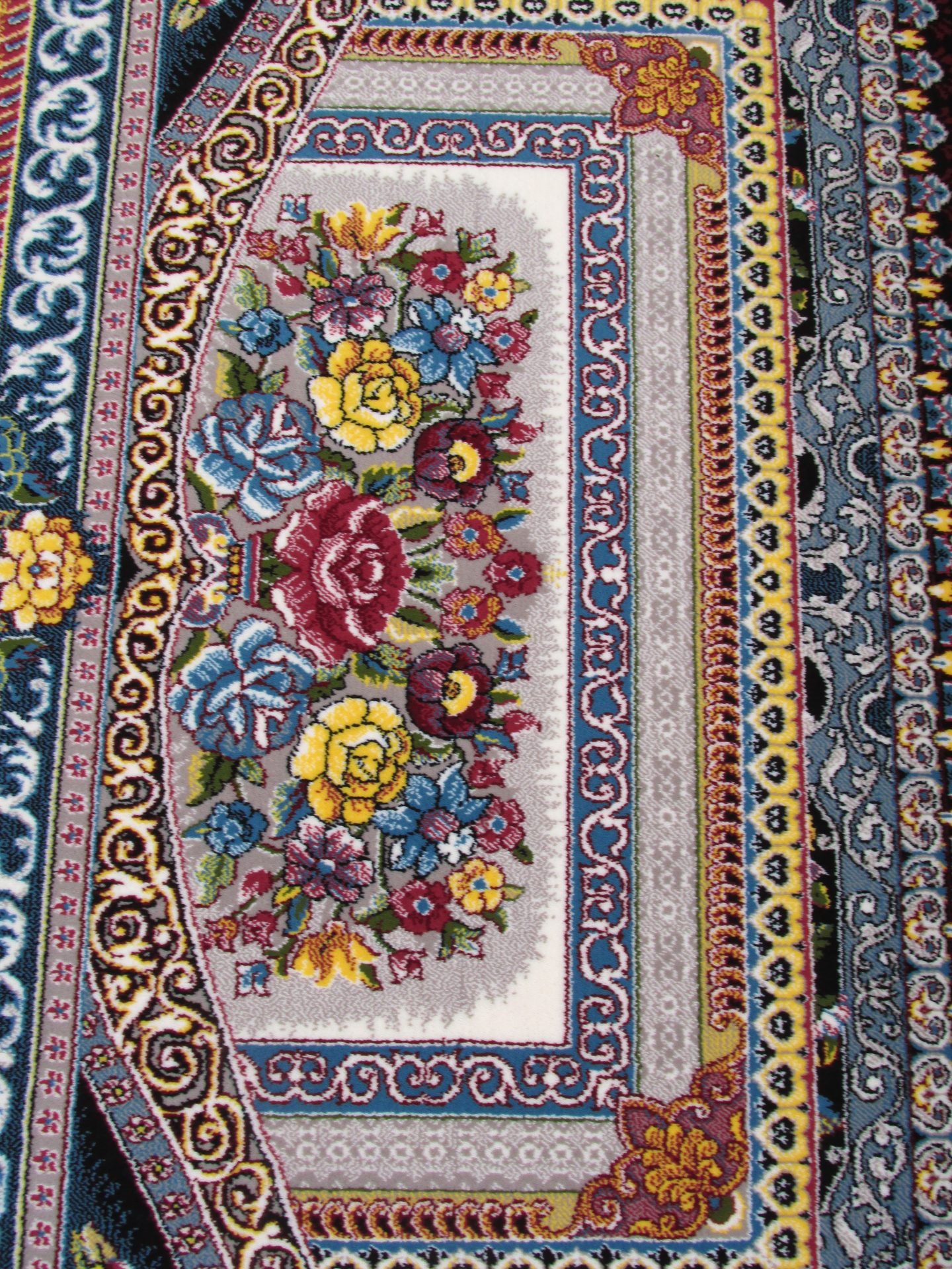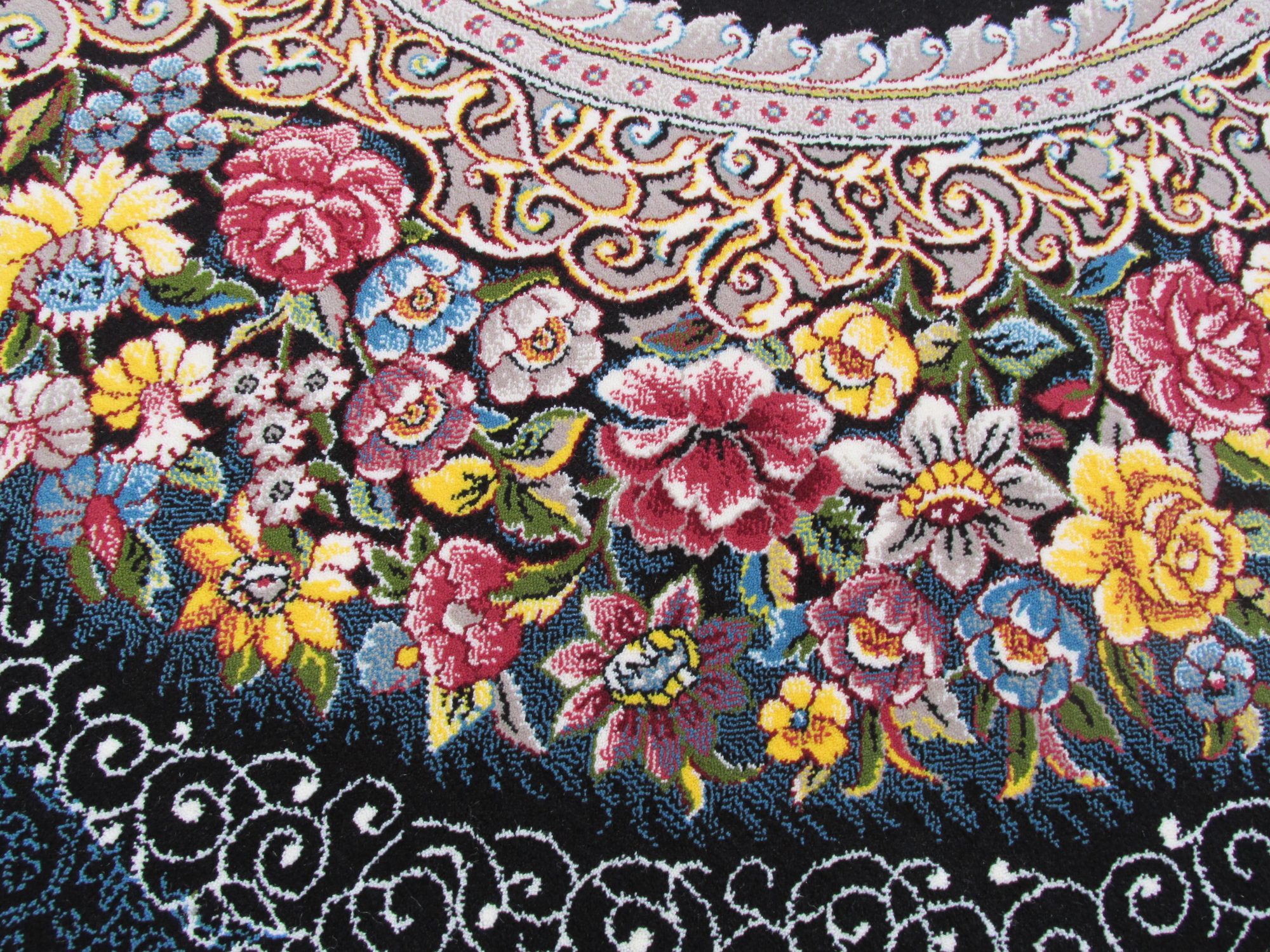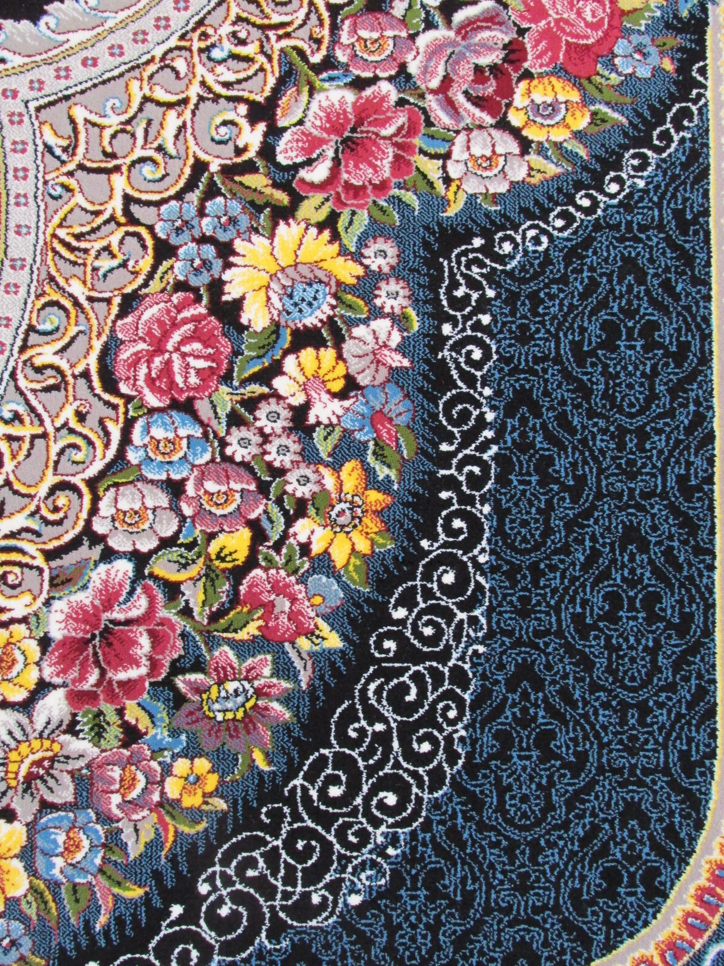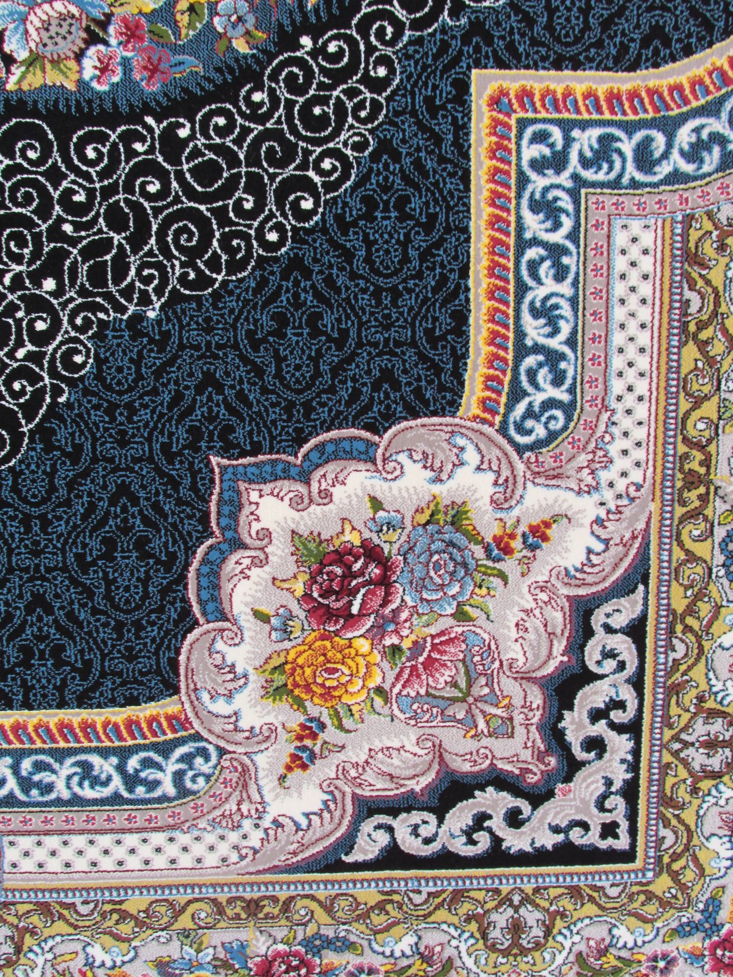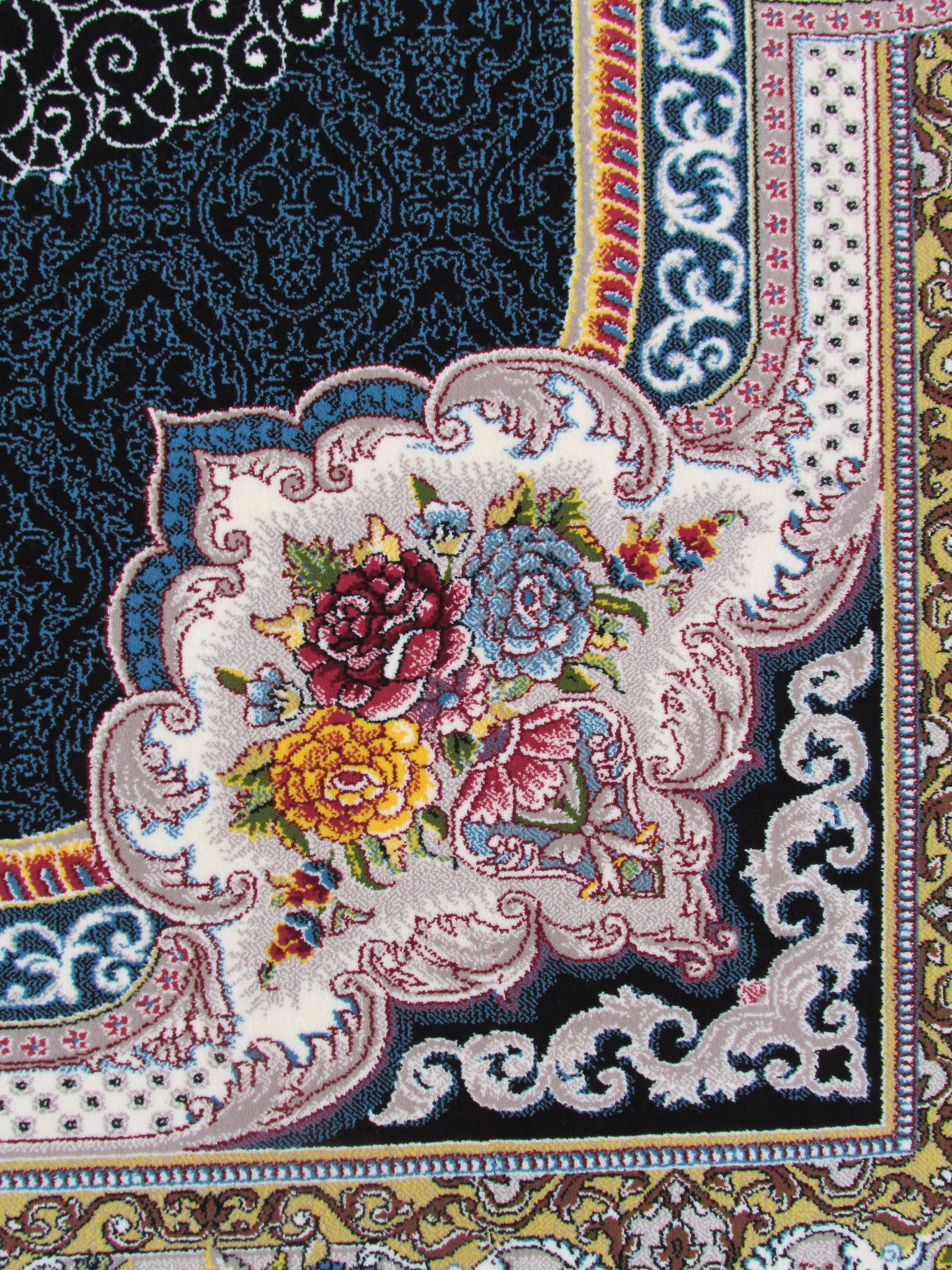 فرش 700 شانه تراکم 2550 طرح باغ معلق سرمهای که در تصویر مشاهده میکنید در ترکیب با رنگهای زرشکی، سفید، لیمویی و فیلی هارمونی زیبا ایجاد کرده و برای شما دکوراسیونی جذاب و مدرن میسازد.