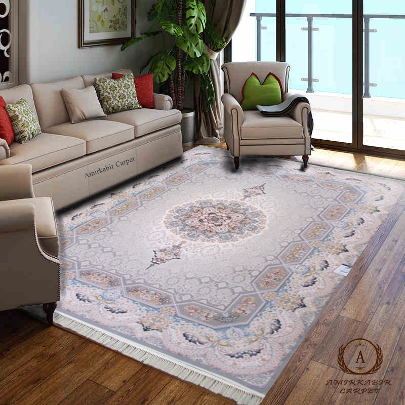 فرش ماشینی طرح هالیدی نقره ای که در تصویر مشاهده میکنید جز دسته محصولات فرش 1200 شانه برجسته شرکت فرش امیرکبیر کاشان است که در تراکم 3600 بافته شده است.