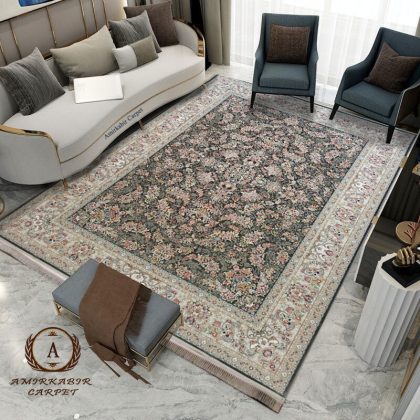 فرش ماشینی طرح لوتوس دودی به صورت گل برجسته بافته شده و جز محصولات