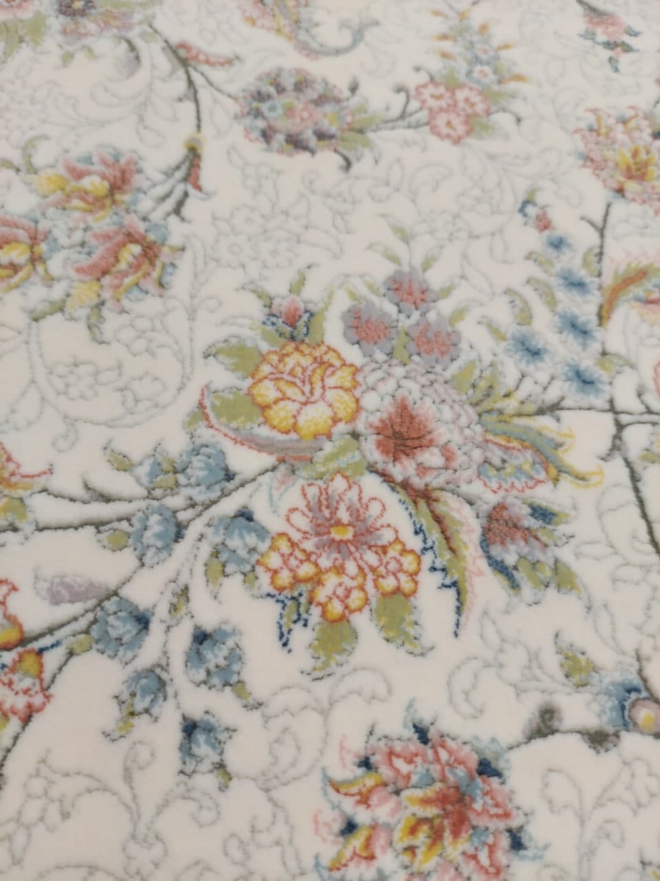 فرش ماشینی ۱۲۰۰ شانه طرح دنیا از جمله طرح های افشان جدید و منحصر به فرد فرش 1200 شانه است که با نخ ابریشمی مانند بافته شده و در صنعت فرش ماشینی جز طرح های پرفروش محسوب می شود. فرش ۱۲۰۰ شانه دنیا کرم با زمینه روشن باعث جذابیت نقشه شده و با گل های خوشه ای نمای منحصر به فردی به فرش داده است.تراکم بالای این فرش باعث شده بسیار به فرش دستباف شبیه بوده و گزینه مناسب برای افرادی باشد که بودجه خرید فرش دستبافت را ندارند.