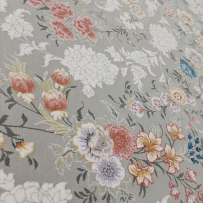 فرش طرح باغ جان نقره ای 1500 شانه گل برجسته با استفاده از پیشرفته ترین دستگاه های موجود و استفاده از بهترین الیاف بافته شده است. الیاف استفاده شده در نخ خاب این فرش اکریلیک هیت ست شده است که از پرزدهی و بروز هرگونه حساسیت جلوگیری می کند.