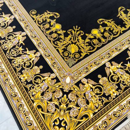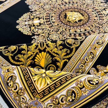فرش ورساچه مشکی طلایی 1200 شانه کد 9005، یکی از نقشه های طرح ورساچه با رنگ زیبای مشکی و طلایی میباشد. ورساچه نام یک طراح لباس به نام جانی ورساچه است. که در زمان بسیار کوتاهی توانست، بخاطر طراحیهای لباس خاص و عامه پسند، برندجهانی شود و سپس به صنایع دیگه نیز مثل عطر، کیف و جواهرات نیز گسترش پیدا کرد. حاشیه هایی که دور تا دور نشان تجاری ورساچه دیده میشود به “گردونه مهر” یا “چَلیپا” شبیه است. این نشانه در معماری و اماکن تاریخی ایران و بسیاری از کشورهای دیگر و در معابد سایر ادیان هم دیده شده است.از این رو نمونههای طرح ورساچه در فرش ماشینی نیز به کار برده شد و امروزه مشتریان خاص خود را نیز دارد.