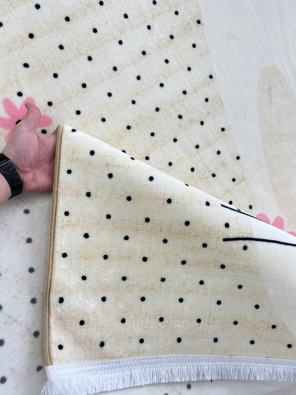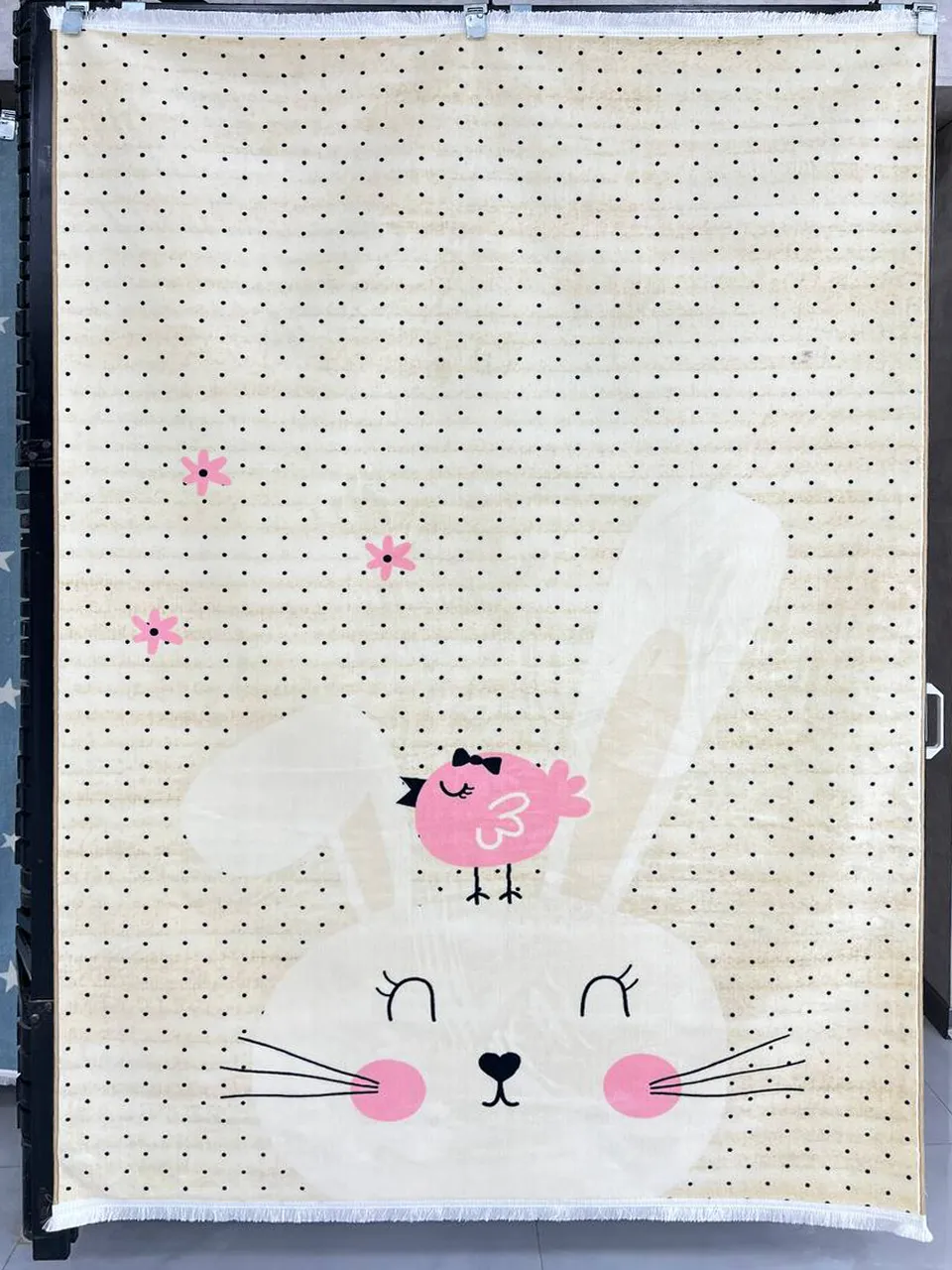 فرش کودک طرح خرگوش و پرنده کد 25KM0160 یکی از پرفروشترین و پرطرفدارترین فرشهای فروشگاه امیرکبیر است. در این طرح بامزه و لطیف، چهرهی مهربان یک خرگوش با گونههای صورتی و یک پرندهی کوچک و خندان دیده میشود که روی سرش نشسته؛ همین ترکیب ساده اما جذاب، حس آرامش و مهربانی را به اتاق کودک شما هدیه میدهد. پسزمینهی کرم رنگ با نقاط ریز مشکی، فرش را چرکتاب کرده و در عین حال روشنایی دلنشینی به فضا میدهد بدون اینکه آن را دلگیر کند.